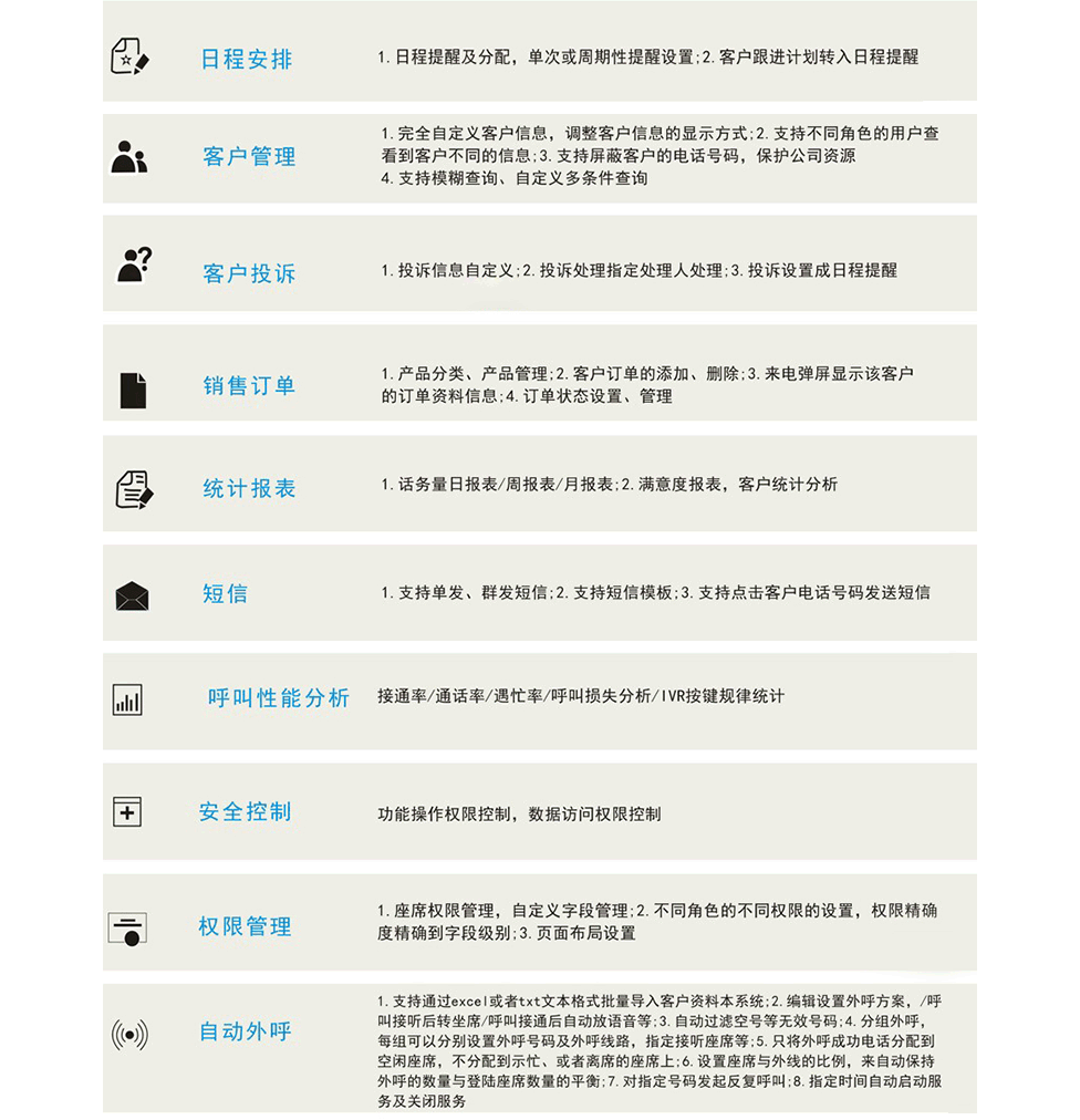 1. 具有來。去電彈屏. 鼠標(biāo)撥號. 錄音. 客戶信息輸入. 分婁. 編組. 修改. 編輯. 導(dǎo)入導(dǎo)出