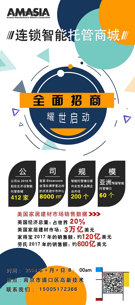 AMASIA家居建材連鎖智能托管商城,近期正在緊鑼密鼓的籌建招商中,面向全球品牌企業(yè)開設200個智能托管鋪位。為配合中國“一帶一路”戰(zhàn)略構想,順應國際經(jīng)貿(mào)合作與經(jīng)貿(mào)機制轉型的需要,其中有60個鋪位面向亞洲國家和地區(qū)。