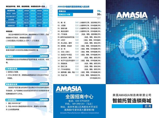 AMASIA連鎖智能托管商城為增強客戶購買力和大宗采購,提高商城入住企業(yè)的訂單額,特向大客戶群體采購商發(fā)放商城 大額度信用卡 ,采購商持信用卡在商城采購,入駐企業(yè)即刻收到貨款,而采購商可半年后向商城還款,商城對企業(yè)端和消費端的金融支持,將進一步推動企業(yè)和商城的快速發(fā)展。跟隨AMASIA連鎖智能托管商城的平臺,在美國迅速入駐商鋪、打造連鎖商鋪、布局全美市場,將使企業(yè)重塑品牌和開拓市場的成本最低,進入美國市場的風險更低,AMASIA商城不僅是國際品牌的 孵化基地也是全球的展示中心,更是一個 永 不落幕的展銷會。