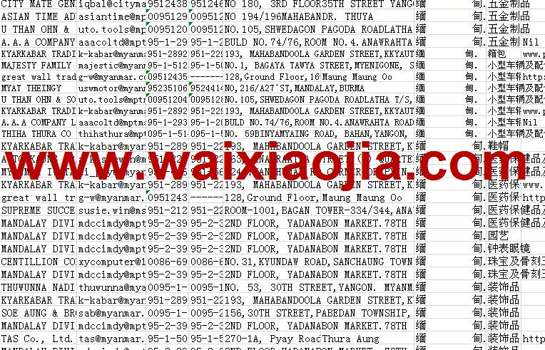緬甸采購商名單數(shù)據(jù)為Excel格式,信息可任意修改、復(fù)制、打印、導(dǎo)出及導(dǎo)入到傳真、郵件群發(fā)等軟件中,無任何限制。
