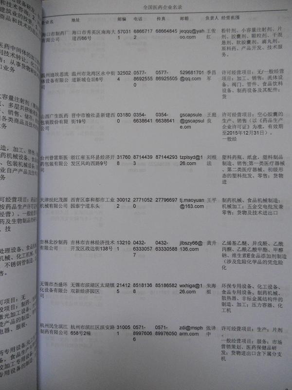醫(yī)藥保健品醫(yī)療器械外貿(mào)企業(yè)黃頁包括:外貿(mào)企業(yè)名稱、地址、電話、傳真、郵箱、經(jīng)營范圍、注冊資金等信息。