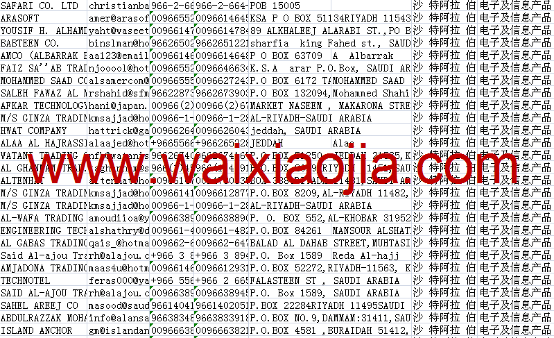 沙特采購(gòu)商名單數(shù)據(jù)為Excel格式,信息可任意修改、復(fù)制、打印、導(dǎo)出及導(dǎo)入到傳真、郵件群發(fā)等軟件中,無(wú)任何限制。