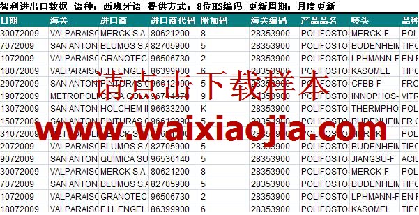 智利進(jìn)口關(guān)單數(shù)據(jù),以智利本土企業(yè)向全球 200 多個(gè)國(guó)家和地區(qū)進(jìn)口各類商品的進(jìn)口申報(bào)單證為依據(jù)。按照具體產(chǎn)品的精確 HS 編碼提供。內(nèi)容包括:進(jìn)口日期、進(jìn)口海關(guān)、進(jìn)口商名稱、 進(jìn)口商代碼、附加碼、海關(guān)編碼、產(chǎn)品品名、嘜頭、品種、原產(chǎn)國(guó)、中轉(zhuǎn)國(guó)、付款方式、交易條款、運(yùn)輸方式、海運(yùn)公司、起運(yùn)港、目的港、貨物類型、重量、重量單位等
