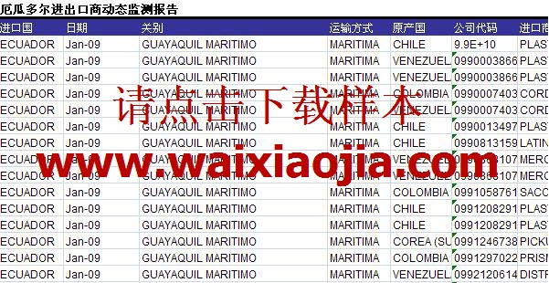 厄瓜多爾進(jìn)口關(guān)單數(shù)據(jù),以厄瓜多爾本土企業(yè)向全球 200 多個國家和地區(qū)進(jìn)口各類商品的進(jìn)口申報單證為依據(jù)。按照具體產(chǎn)品的精確 HS 編碼提供。 數(shù)據(jù)內(nèi)容包括:進(jìn)口國、日期、關(guān)別、運輸方式、原產(chǎn)國、公司代碼、進(jìn)口商名稱、進(jìn)口商地址、海關(guān)編碼、產(chǎn)品描述、計量單位、運費、倉單號碼、 FOB 單價、 總金額、總凈重、總毛重、 FOB 總值、 CIF 總值、 海關(guān)總值等核心情報信息。