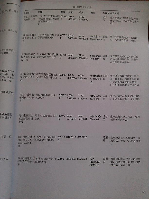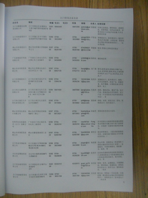 2021版最新江門企業(yè)黃頁包括《江門制造企業(yè)黃頁》、《江門貿(mào)易企業(yè)黃頁》、《江門民營(yíng)企業(yè)黃頁》、《江門外資企業(yè)黃頁》、《江門外貿(mào)企業(yè)黃頁》共五冊(cè),現(xiàn)優(yōu)惠價(jià):280元/冊(cè)。每?jī)?cè)內(nèi)容包括:?jiǎn)挝幻Q、地址、郵編、電話、傳真、郵箱、經(jīng)營(yíng)范圍等;江門企業(yè)黃頁涵蓋了近幾年來最新成立的、有一定規(guī)模的企業(yè),具有非常高的營(yíng)銷價(jià)值。有了這套黃頁開展業(yè)務(wù)也有了針對(duì)性,也省去了盲目去尋找客戶名單而浪費(fèi)的時(shí)間了,工作效率也會(huì)有很大的提高。歡迎需要江門企業(yè)黃頁的朋友及時(shí)聯(lián)系我們!