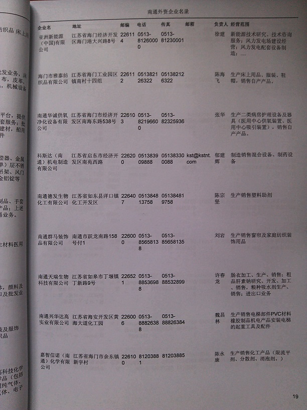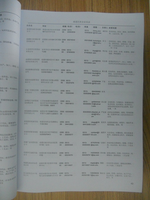 2021版最新南通企業(yè)黃頁(yè)包括《南通制造企業(yè)黃頁(yè)》、《南通貿(mào)易企業(yè)黃頁(yè)》、《南通民營(yíng)企業(yè)黃頁(yè)》、《南通外資企業(yè)黃頁(yè)》、《南通外貿(mào)企業(yè)黃頁(yè)》共五冊(cè),現(xiàn)優(yōu)惠價(jià):280元/冊(cè)。每?jī)?cè)內(nèi)容包括:?jiǎn)挝幻Q(chēng)、地址、郵編、電話(huà)、傳真、郵箱、經(jīng)營(yíng)范圍等;南通企業(yè)黃頁(yè)涵蓋了近幾年來(lái)最新成立的、有一定規(guī)模的企業(yè),具有非常高的營(yíng)銷(xiāo)價(jià)值。有了這套黃頁(yè)開(kāi)展業(yè)務(wù)也有了針對(duì)性,也省去了盲目去尋找客戶(hù)名單而浪費(fèi)的時(shí)間了,工作效率也會(huì)有很大的提高。歡迎需要南通企業(yè)黃頁(yè)的朋友及時(shí)聯(lián)系我們!