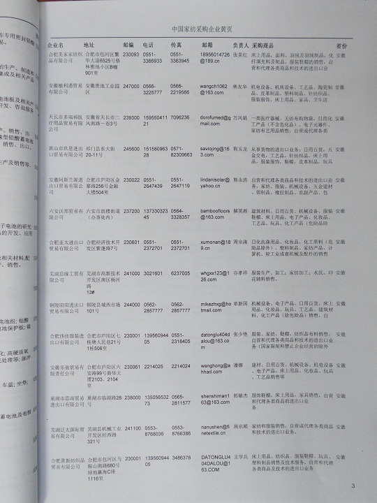 2024年新版中國(guó)家紡采購(gòu)企業(yè)黃頁(yè),收錄了全國(guó)各地經(jīng)營(yíng)范圍涉及家紡產(chǎn)品的貿(mào)易企業(yè),這些都是頗具實(shí)力的家紡產(chǎn)品的中國(guó)采購(gòu)商。黃頁(yè)內(nèi)容包含:企業(yè)名稱(chēng)、地址、電話(huà)、傳真、郵箱、經(jīng)營(yíng)范圍、省份、注冊(cè)資金等信息。該套黃頁(yè)包含一個(gè)黃頁(yè)光碟加一冊(cè)紙質(zhì)書(shū)刊,全國(guó)價(jià)格:1500元,省/直轄市價(jià)格:400元元,城市價(jià)格:200元,共收錄了全國(guó)各地大概4945398(統(tǒng)計(jì)日期:2018.1)家。黃頁(yè)光碟中是EXCEL格式,信息可任意修改、復(fù)制、打印、導(dǎo)出及導(dǎo)入到傳真、郵件群發(fā)等軟件中,無(wú)任何限制。