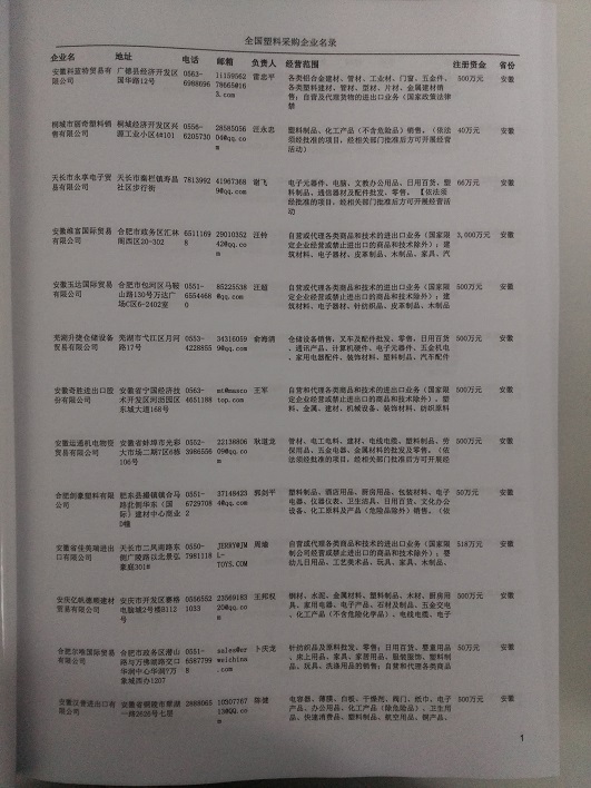 2024年新版中國塑料采購企業(yè)黃頁,收錄了全國各地經(jīng)營范圍涉及塑料產(chǎn)品的貿(mào)易企業(yè),這些都是頗具實(shí)力的塑料產(chǎn)品的中國采購商。黃頁內(nèi)容包含:企業(yè)名稱、地址、電話、傳真、郵箱、經(jīng)營范圍、省份、注冊(cè)資金等信息。該套黃頁包含一個(gè)黃頁光碟加一冊(cè)紙質(zhì)書刊,全國價(jià)格:1500元元,省/直轄市價(jià)格:400元,城市價(jià)格:200元,共收錄了全國各地大概6700(統(tǒng)計(jì)日期:2018.1)家塑料產(chǎn)品采購企業(yè)。黃頁光碟中是EXCEL格式,信息可任意修改、復(fù)制、打印、導(dǎo)出及導(dǎo)入到傳真、郵件群發(fā)等軟件中,無任何限制。
