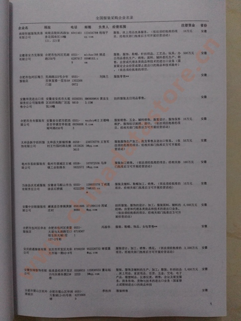 2024年新版中國服裝采購企業(yè)黃頁,收錄了全國各地經(jīng)營范圍涉及服裝產(chǎn)品的貿(mào)易企業(yè),這些都是頗具實(shí)力的服裝產(chǎn)品的中國采購商。黃頁內(nèi)容包含:企業(yè)名稱、地址、電話、傳真、郵箱、經(jīng)營范圍、省份、注冊資金等信息。該套黃頁包含一個(gè)黃頁光碟加一冊紙質(zhì)書刊,全國的價(jià)格:1500元,省/直轄市價(jià)格:400元,城市價(jià)格:200元,共收錄了全國各地大概46646(統(tǒng)計(jì)日期:2018.1)服裝裝產(chǎn)品采購企業(yè)。黃頁光碟中是EXCEL格式,信息可任意修改、復(fù)制、打印、導(dǎo)出及導(dǎo)入到傳真、郵件群發(fā)等軟件中,無任何限制。