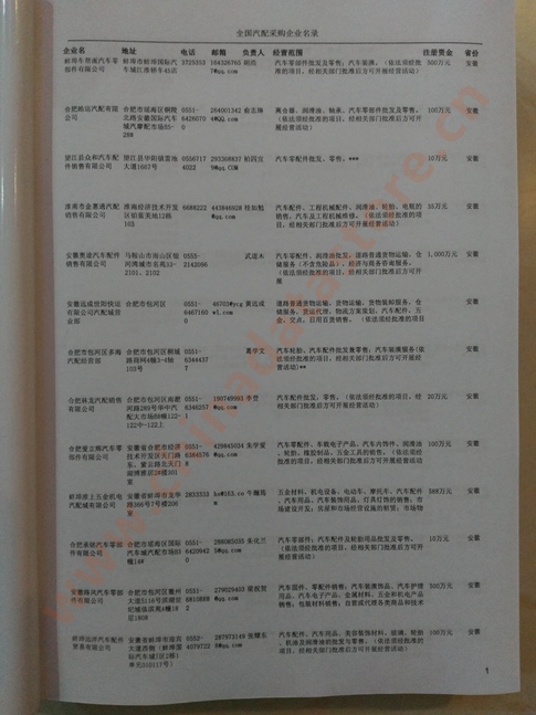 2024年新版中國(guó)汽配采購(gòu)企業(yè)黃頁(yè),收錄了全國(guó)各地經(jīng)營(yíng)范圍涉及汽配產(chǎn)品的貿(mào)易企業(yè),這些都是頗具實(shí)力的汽配產(chǎn)品的中國(guó)采購(gòu)商。黃頁(yè)內(nèi)容包含:企業(yè)名稱、地址、電話、傳真、郵箱、經(jīng)營(yíng)范圍、省份、注冊(cè)資金等信息。該套黃頁(yè)包含一個(gè)黃頁(yè)光碟加一冊(cè)紙質(zhì)書刊,全國(guó)價(jià)格:1500元,省/直轄市價(jià)格:400元,城市價(jià)格:200元,共收錄了全國(guó)各地大概8952(統(tǒng)計(jì)日期:2018.1)家汽配產(chǎn)品采購(gòu)企業(yè)。黃頁(yè)光碟中是EXCEL格式,信息可任意修改、復(fù)制、打印、導(dǎo)出及導(dǎo)入到傳真、郵件群發(fā)等軟件中,無(wú)任何限制。