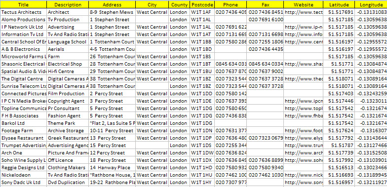 包含字段有:公司名稱,地址,城市,地區(qū),郵編,SIC代碼,手機(jī),部分企業(yè)還有網(wǎng)站及傳真。