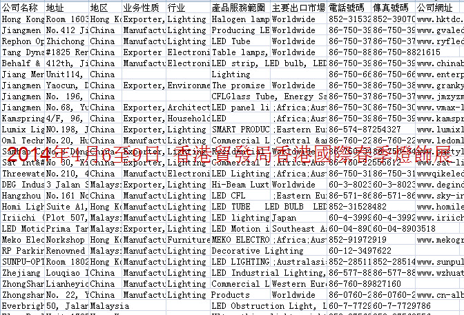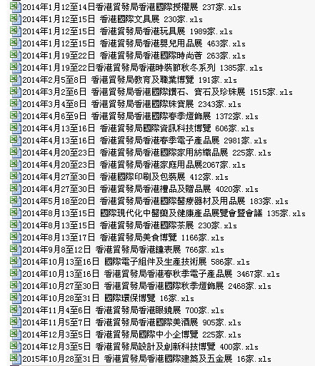 簡介:2014年香港貿(mào)發(fā)局展會會刊共收錄30個展會參展商信息。數(shù)據(jù)格式EXCEL,會刊內(nèi)容包含:公司名稱、地址、地區(qū)、業(yè)務(wù)性質(zhì)、行業(yè)、產(chǎn)品服務(wù)范圍、出口市場、電話、傳真、網(wǎng)址。