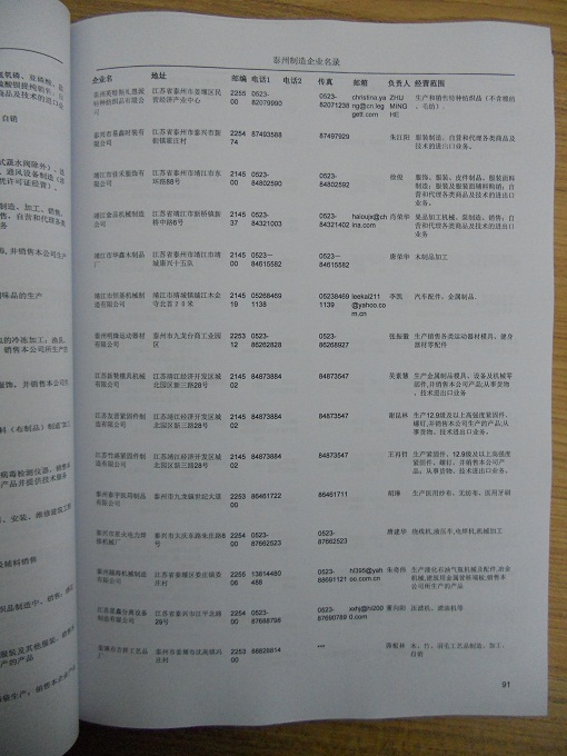 2021版最新泰州企業(yè)黃頁(yè)包括《泰州制造企業(yè)黃頁(yè)》、《泰州民營(yíng)企業(yè)黃頁(yè)》,現(xiàn)優(yōu)惠價(jià):280元/冊(cè)。每?jī)?cè)內(nèi)容包括:?jiǎn)挝幻Q、地址、郵編、電話、傳真、郵箱、經(jīng)營(yíng)范圍等;泰州企業(yè)黃頁(yè)涵蓋了近幾年來最新成立的、有一定規(guī)模的企業(yè),具有非常高的營(yíng)銷價(jià)值。有了這套黃頁(yè)開展業(yè)務(wù)也有了針對(duì)性,也省去了盲目去尋找客戶名單而浪費(fèi)的時(shí)間了,工作效率也會(huì)有很大的提高。歡迎需要泰州企業(yè)黃頁(yè)的朋友及時(shí)聯(lián)系我們!
