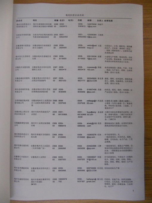 2021版最新亳州企業(yè)黃頁包括《亳州制造企業(yè)黃頁》、《亳州民營企業(yè)黃頁》,現(xiàn)優(yōu)惠價(jià):280元/冊(cè)。每?jī)?cè)內(nèi)容包括:?jiǎn)挝幻Q、地址、郵編、電話、傳真、郵箱、經(jīng)營范圍等;亳州企業(yè)黃頁涵蓋了近幾年來最新成立的、有一定規(guī)模的企業(yè),具有非常高的營銷價(jià)值。有了這套黃頁開展業(yè)務(wù)也有了針對(duì)性,也省去了盲目去尋找客戶名單而浪費(fèi)的時(shí)間了,工作效率也會(huì)有很大的提高。歡迎需要亳州企業(yè)黃頁的朋友及時(shí)聯(lián)系我們!