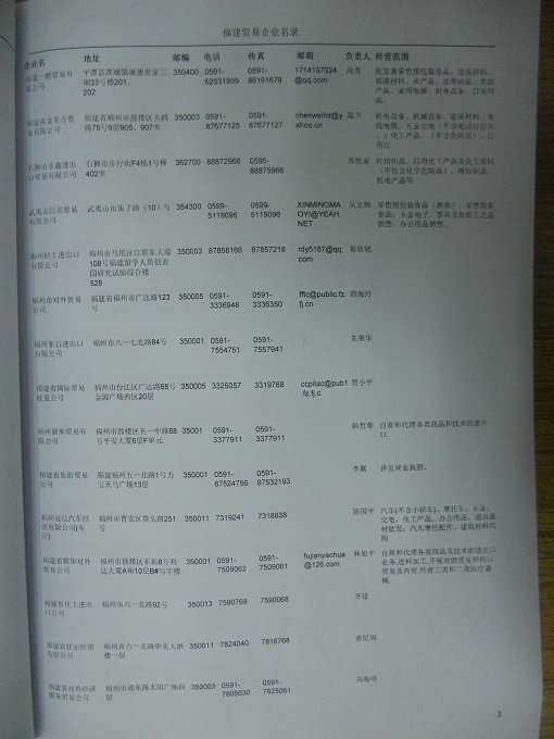 2021版最新福建企業(yè)黃頁包括《福建制造企業(yè)黃頁》、《福建貿(mào)易企業(yè)黃頁》、《福建民營企業(yè)黃頁》共三冊,優(yōu)惠價(jià):280元/冊。每冊內(nèi)容包括:單位名稱、地址、郵編、電話、傳真、郵箱、經(jīng)營范圍等;福建企業(yè)黃頁涵蓋了近幾年來最新成立的、有一定規(guī)模的企業(yè),具有非常高的營銷價(jià)值。有了這套黃頁開展業(yè)務(wù)也有了針對性,也省去了盲目去尋找客戶名單而浪費(fèi)的時(shí)間了,工作效率也會(huì)有很大的提高。歡迎需要福建企業(yè)黃頁的朋友及時(shí)聯(lián)系我們!