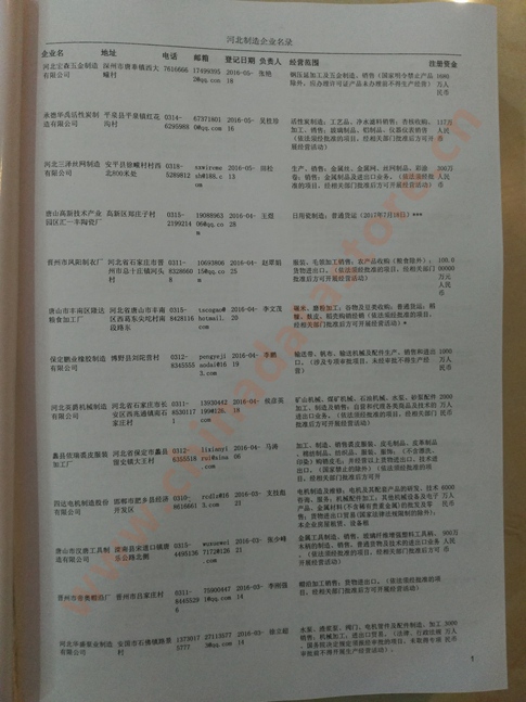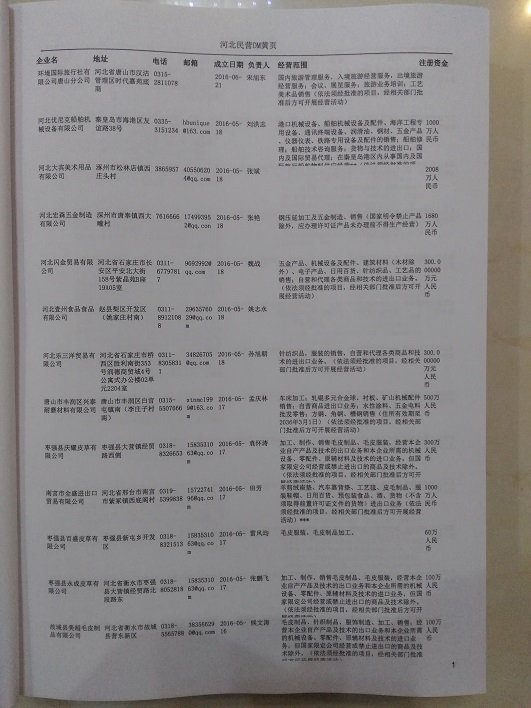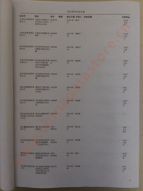 2021版最新河北企業(yè)黃頁包括《河北制造企業(yè)黃頁》、《河北貿(mào)易企業(yè)黃頁》、《河北民營企業(yè)黃頁》共三冊,優(yōu)惠價(jià):280元/冊。每冊內(nèi)容包括:單位名稱、地址、郵編、電話、傳真、郵箱、經(jīng)營范圍等;河北企業(yè)黃頁涵蓋了近幾年來最新成立的、有一定規(guī)模的企業(yè),具有非常高的營銷價(jià)值。有了這套黃頁開展業(yè)務(wù)也有了針對性,也省去了盲目去尋找客戶名單而浪費(fèi)的時(shí)間了,工作效率也會(huì)有很大的提高。歡迎需要河北企業(yè)黃頁的朋友及時(shí)聯(lián)系我們!