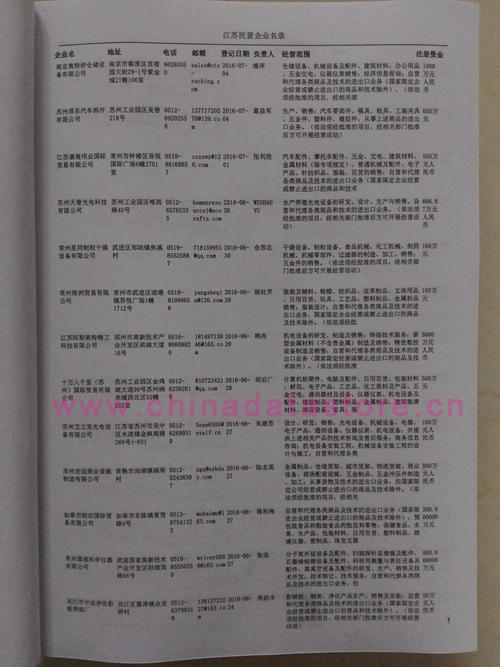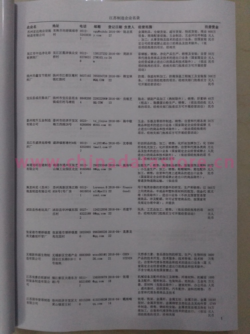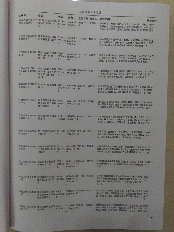 2021版最新江蘇企業(yè)黃頁包括《江蘇制造企業(yè)黃頁》、《江蘇貿(mào)易企業(yè)黃頁》、《江蘇民營企業(yè)黃頁》共三冊,優(yōu)惠價:280元/冊。每冊內(nèi)容包括:單位名稱、地址、郵編、電話、傳真、郵箱、經(jīng)營范圍等;江蘇企業(yè)黃頁涵蓋了近幾年來最新成立的、有一定規(guī)模的企業(yè),具有非常高的營銷價值。有了這套黃頁開展業(yè)務(wù)也有了針對性,也省去了盲目去尋找客戶名單而浪費(fèi)的時間了,工作效率也會有很大的提高。歡迎需要江蘇企業(yè)黃頁的朋友及時聯(lián)系我們!