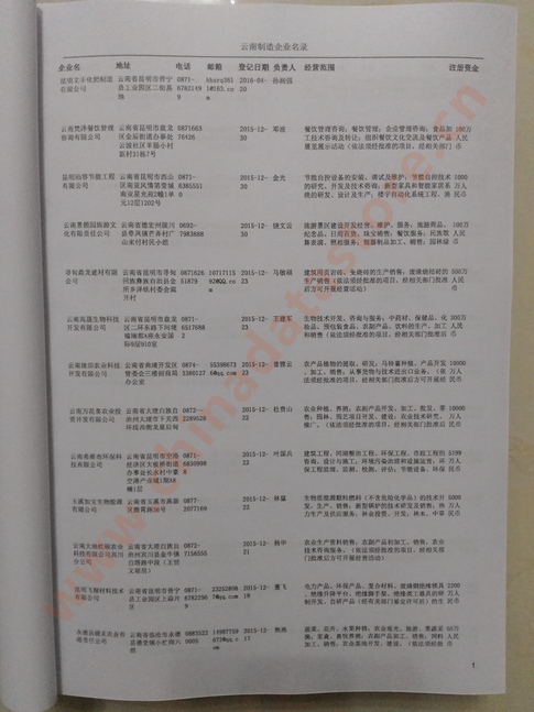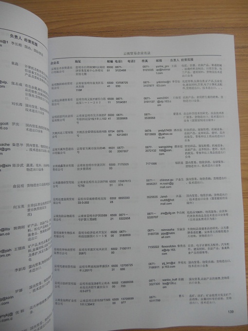 2021版最新云南企業(yè)黃頁包括《云南制造企業(yè)黃頁》、《云南貿易企業(yè)黃頁》、《云南民營企業(yè)黃頁》共三冊,優(yōu)惠價:280元/冊。每冊內容包括:單位名稱、地址、郵編、電話、傳真、郵箱、經(jīng)營范圍等;云南企業(yè)黃頁涵蓋了近幾年來最新成立的、有一定規(guī)模的企業(yè),具有非常高的營銷價值。有了這套黃頁開展業(yè)務也有了針對性,也省去了盲目去尋找客戶名單而浪費的時間了,工作效率也會有很大的提高。歡迎需要云南企業(yè)黃頁的朋友及時聯(lián)系我們!