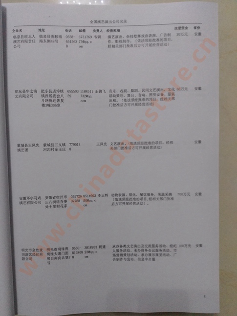 某省或直轄市 | 如上海、浙江演藝演出企業(yè)名單 | 80% - 90% | 600元 | 附贈(zèng)一冊(cè)演藝演出紙質(zhì)印刷品 |