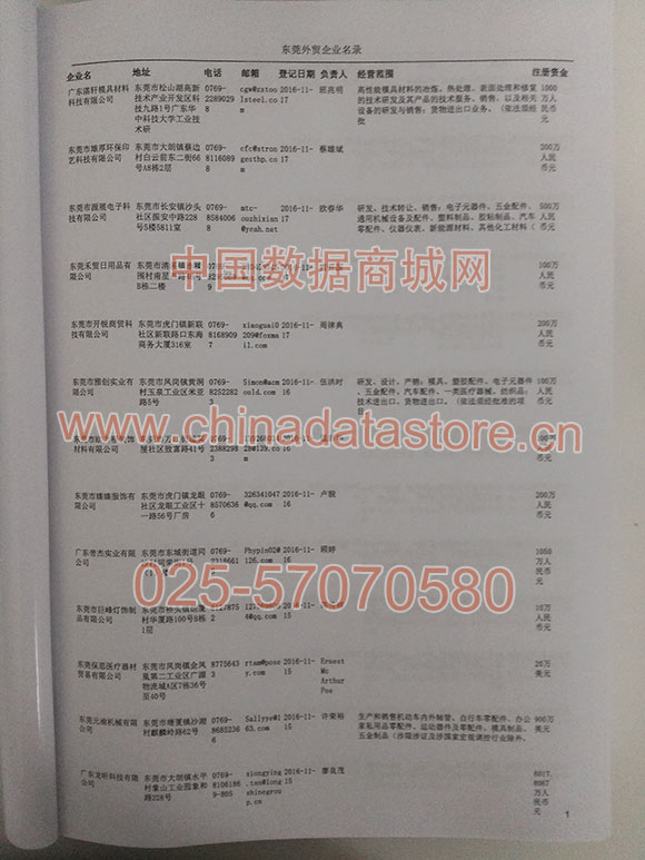 東莞外貿(mào)企業(yè)黃頁包括:外貿(mào)企業(yè)名稱、地址、電話、傳真、郵箱、經(jīng)營范圍、注冊資金等信息。