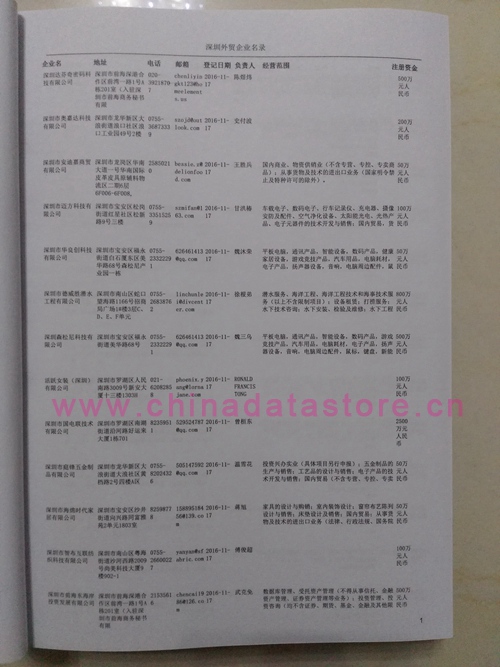 深圳外貿(mào)企業(yè)黃頁包括:外貿(mào)企業(yè)名稱、地址、電話、傳真、郵箱、經(jīng)營范圍、注冊(cè)資金等信息。