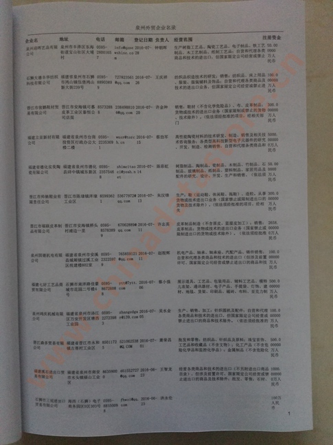 泉州外貿(mào)企業(yè)黃頁包括:外貿(mào)企業(yè)名稱、地址、電話、傳真、郵箱、經(jīng)營范圍、注冊資金等信息。
