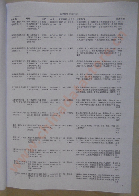 福建外貿(mào)企業(yè)黃頁包括:外貿(mào)企業(yè)名稱、地址、電話、傳真、郵箱、經(jīng)營范圍、注冊資金等信息。