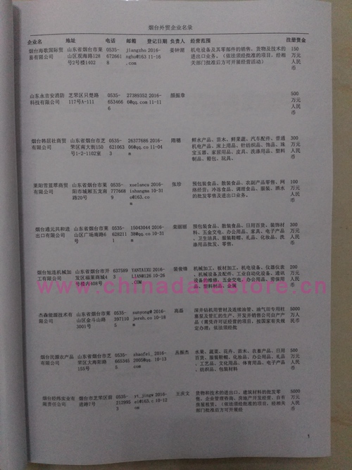 煙臺(tái)外貿(mào)企業(yè)黃頁包括:外貿(mào)企業(yè)名稱、地址、電話、傳真、郵箱、經(jīng)營范圍、注冊(cè)資金等信息。