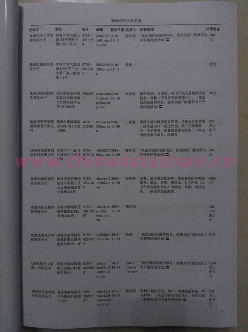 珠海外貿(mào)企業(yè)黃頁包括:外貿(mào)企業(yè)名稱、地址、電話、傳真、郵箱、經(jīng)營范圍、注冊資金等信息。
