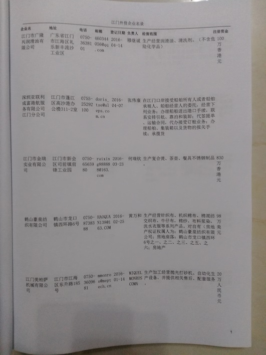 江門外貿(mào)企業(yè)黃頁包括:外貿(mào)企業(yè)名稱、地址、電話、傳真、郵箱、經(jīng)營范圍、注冊資金等信息。